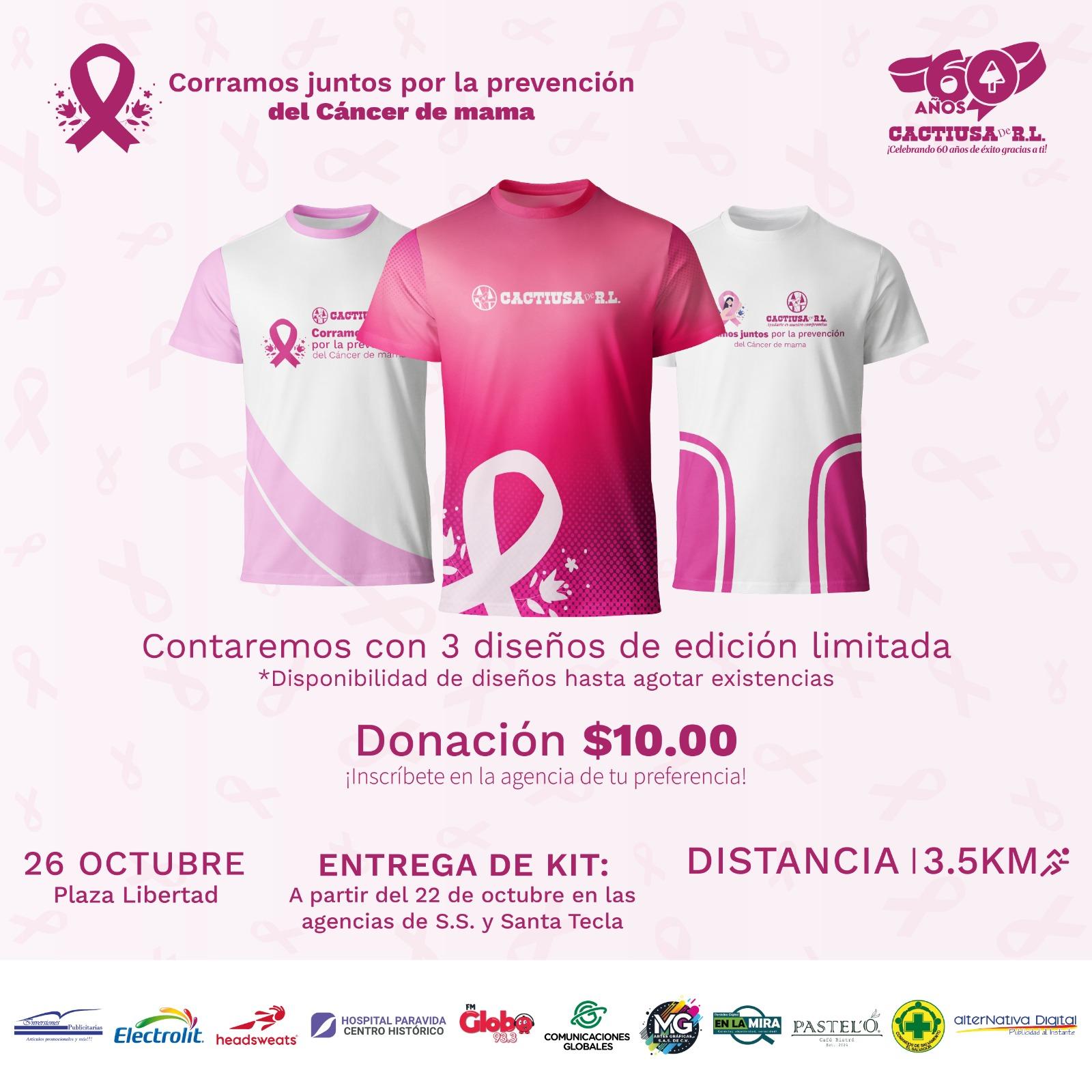 ¡Se parte de esta noble causa al participar en la 4°Carrera de CACTIUSA De L. "Corramos juntos por la prevención del cáncer de mama"! Sólo debes dar un donativo de $ 10.00 que es destinado para los programas médicos de FUNDAMUSA y recibes un kit. Acércate a cualquiera de las 9 agencias de CACTIUSA De R.L. para inscribirte. Más información en el 2237-6320 o al WhatsApp 6102-1940