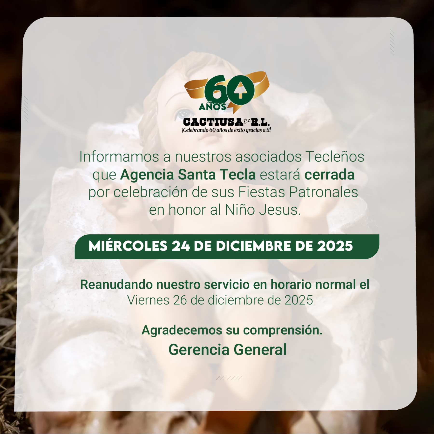 Informamos a los asociados tecleños que Agencia Santa Tecla, estará cerrada el 24 de diciembre por la celebración de las fiestas patronales en honor al niño Jesús. Reanudando el servicio el viernes 26 de diciembre en horario normal. Muchas gracias por la comprensión.